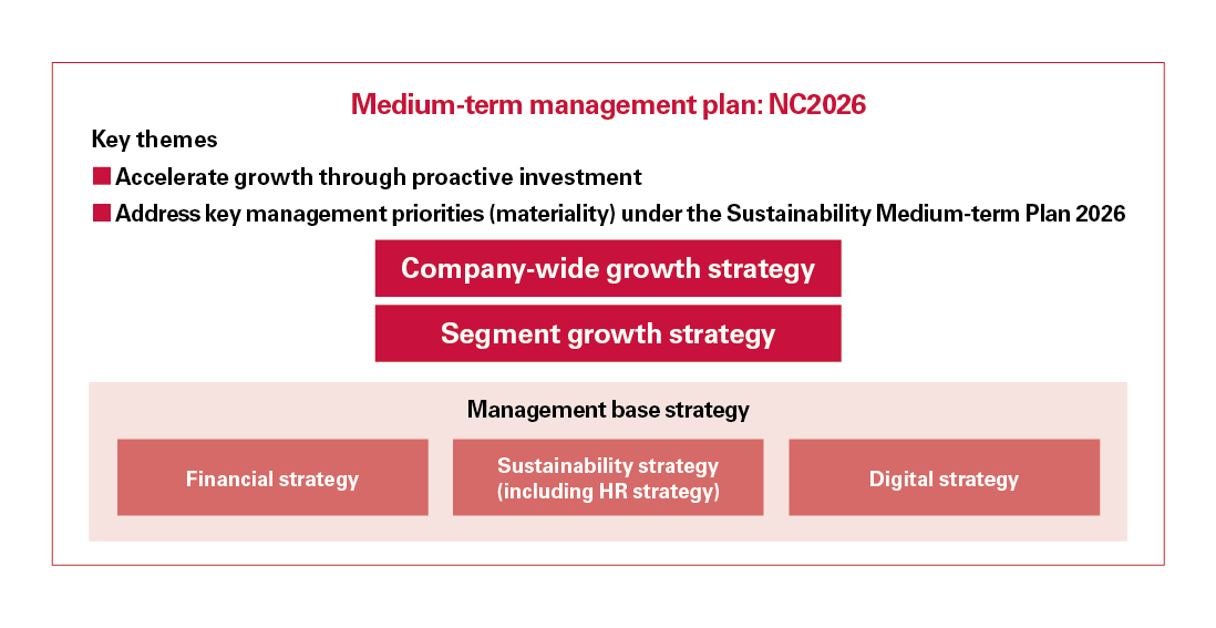 As the second year of NC2026, FY2025 will be a year of steadily taking steps toward the realization of IK Vision 2030 while adapting to ongoing changes in the world around us. This fiscal year, we remain committed to steadily and actively advancing the key initiatives outlined in our management plan: proactive investment and addressing key management materiality through our Sustainability Medium-term Plan. The individual strategies are as follows.