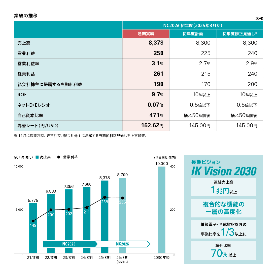 長期ビジョンIK Vision 2030に掲げた、「連結売上高1兆円以上」という定量目標達成への歩みは順調ですが、円安効果の恩恵を受けており、まだ安心できる状態ではありません。主力事業の拡大と成長ポテンシャルの高い事業への経営資源の投入を並行して行い、トップラインを上げていくしかありません。