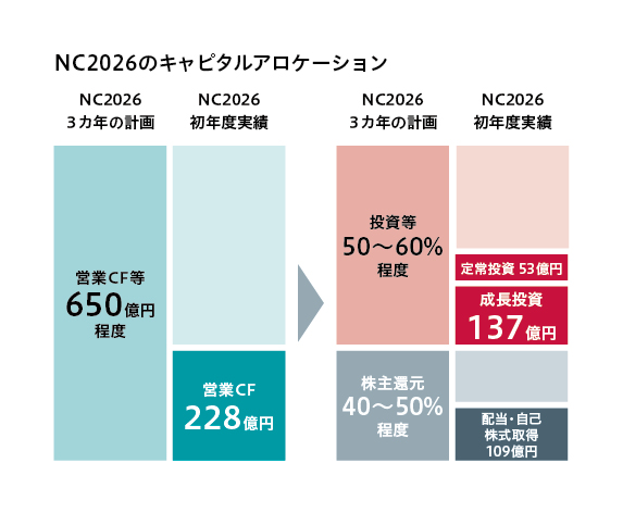 NC2026の3カ年は、さらなる投資の積極化による成長の加速をメインテーマに掲げています。キャピタルアロケーションの方針は、3カ年で650億円程度を想定している営業キャッシュフロー等のうち約5~6 割、つまり金額ベースで350~400億円程度を成長投資に充てていくというものです。初年度は約130億円を実施し、前述したノバセル株式会社の株式取得をはじめ、複合機能の高度化など、「全社 成長戦略」に沿った投資を行っています。