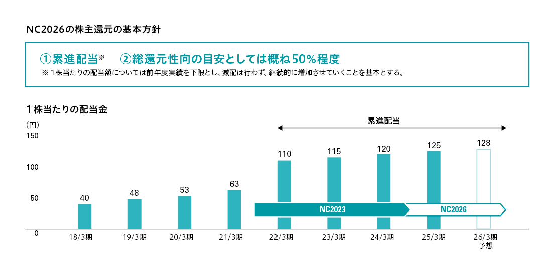 ここ数年は、政策保有株式の売却によって最終利益がかさ上げされてきた面がありますが、すでにその大半は売却が完了しています。したがって、今後は売却で得たキャッシュに頼ることなく、事業で創出した利益を、成長投資に振り向けていきます。そしてNC2026の財務戦略に掲げた通り、株主資本コストを上回るROE水準=10%以上を維持しつつ、PBR1倍を常態的に超える株価水準の早期達成を目指します。これまでは、累進配当や還元性向を高めることで市場の評価を高めてきました。しかし「PBR>1」の常態化を目指すには、冒頭で申し上げた4期連続での増収・増益や、株式上場後は一度も赤字決算を計上していない実績、グローバルな事業基盤と情報網などを積極的にアピールすることで、当社の実績・強みをご理解いただき、将来への期待感を醸成していく必要があると認識しています。