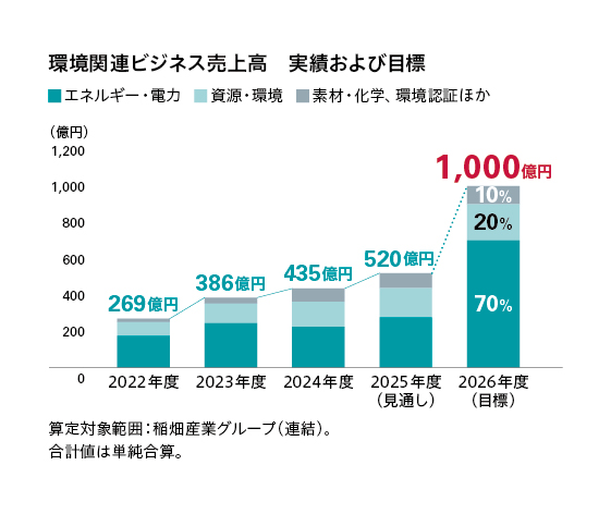 2026」においても「環境関連ビジネスの拡大」を全社成長戦略として掲げるとともに、同時に発表した「サステナビリティ中期計画2026」において数値目標を掲げ、全セグメントで取り組みを進めています。