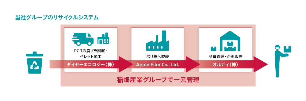当社は2023年に、各業者が個別に取り組んでいた廃プラスチック回収、ペレット化、製品化、品質管理、企画販売の各機能を統合し、グループ全体で一貫したリサイクルシステムを構築しました。これによって市場で使用済みのプラスチックを効率的にマテリアルリサイクルし、ポリ袋などのプラスチック製品として販売することが可能となりました。
