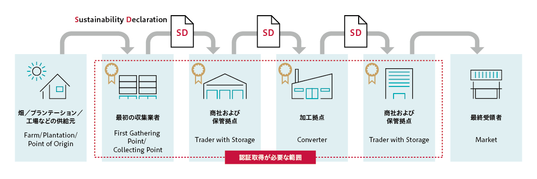 ISCC認証では、CoC(Chain of Custody:加工・流通する過程で適切に管理・加工していることを証明する仕組み)の方式でトレーサビリティを担保しているため、バリューチェーンに関わるすべての組織が認証を取得する必要があります。また、「Sustainability Declaration(持続可能性宣言書)」と呼ばれる書類を各拠点で発行し、次の拠点へ渡すことで情報をつないでいきます。