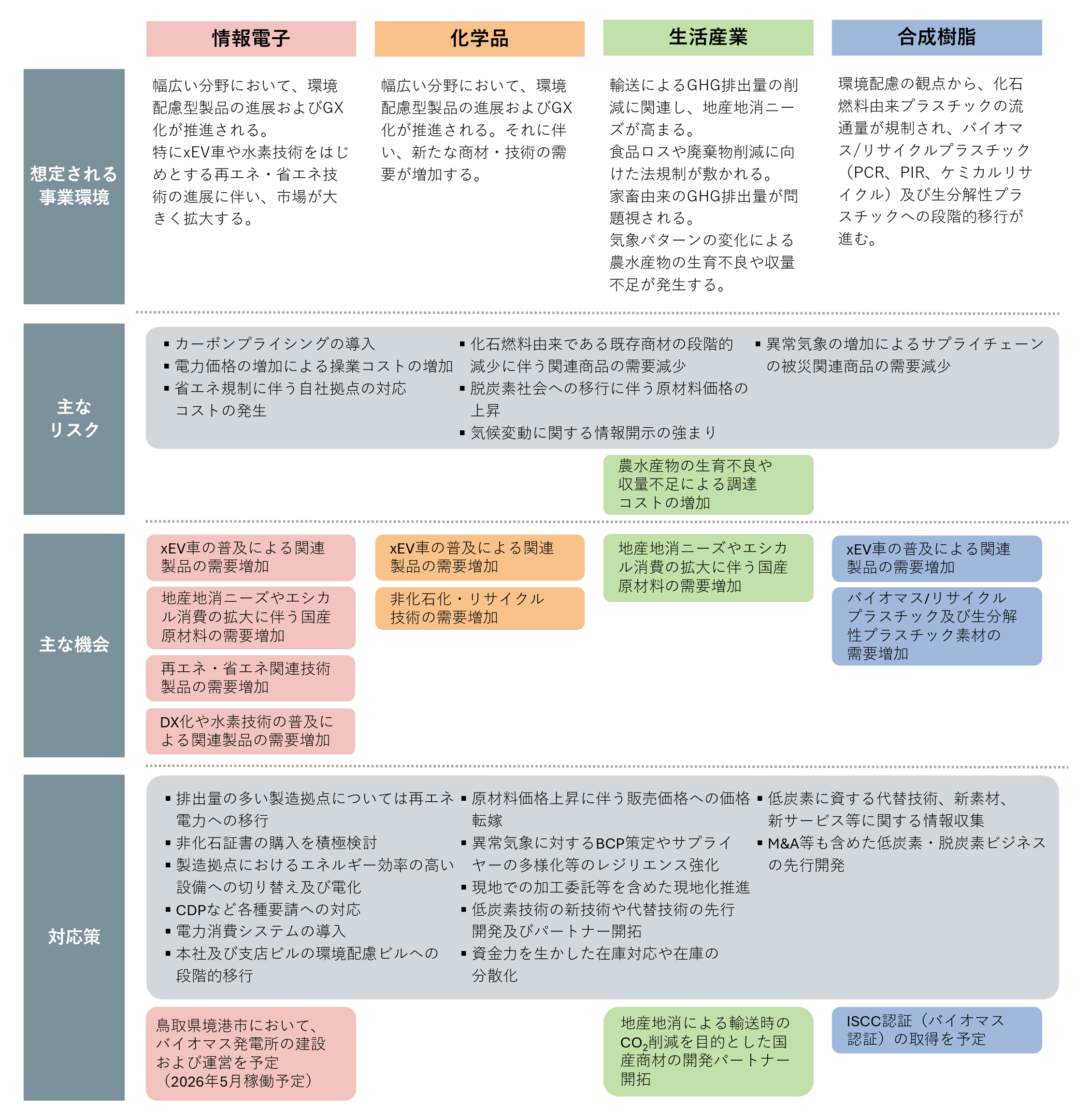 続いて、事業セグメントごとの定性的なシナリオ分析を行いました。参考シナリオや①②で整理した内容などを基に、「想定される事業環境」「主なリスク」「主な機会」を1.5℃・4℃シナリオそれぞれで分析しました。加えて、リスク対応と機会獲得に向けた今後の対応策についても整理しました。