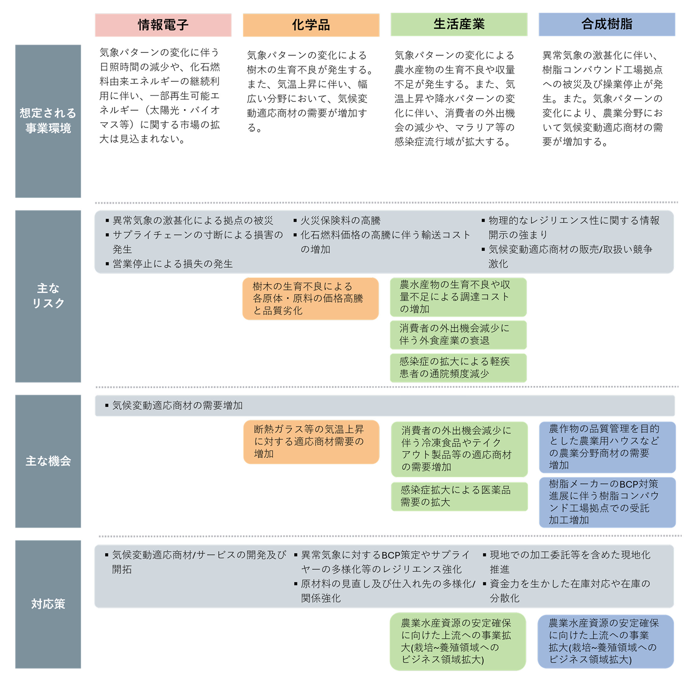 それぞれのセグメントは、取り扱う商材が違うというだけでなく、販売する市場やサプライチェーンなども大きく違います。そのため、気候変動リスクに対しても、以下のとおり、影響があるリスクやその影響の大きさについても差異が認められました。
