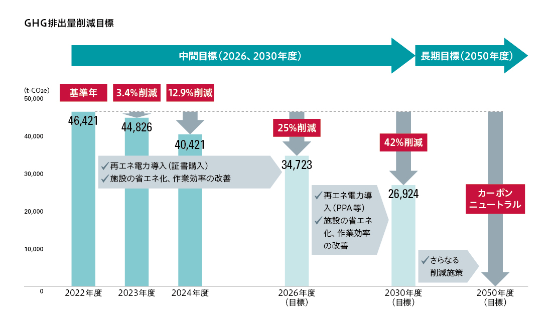 当社グループでは、パリ協定で掲げられた「気温上昇を1.5℃未満に抑える」という世界的な目標達成にコミットすべく、2050年度カーボンニュートラルという長期目標を設定しています。(連結グループのスコープ1,2が対象)また、「サステナビリティ中期計画2026」の中で「GHG排出量を2022年度比2026年度までに25%削減、2030年度までに42%削減(連結グループのスコープ1,2が対象)」という中間目標を定めました。本目標は、パリ協定で示された1.5℃目標に整合する設定としました。