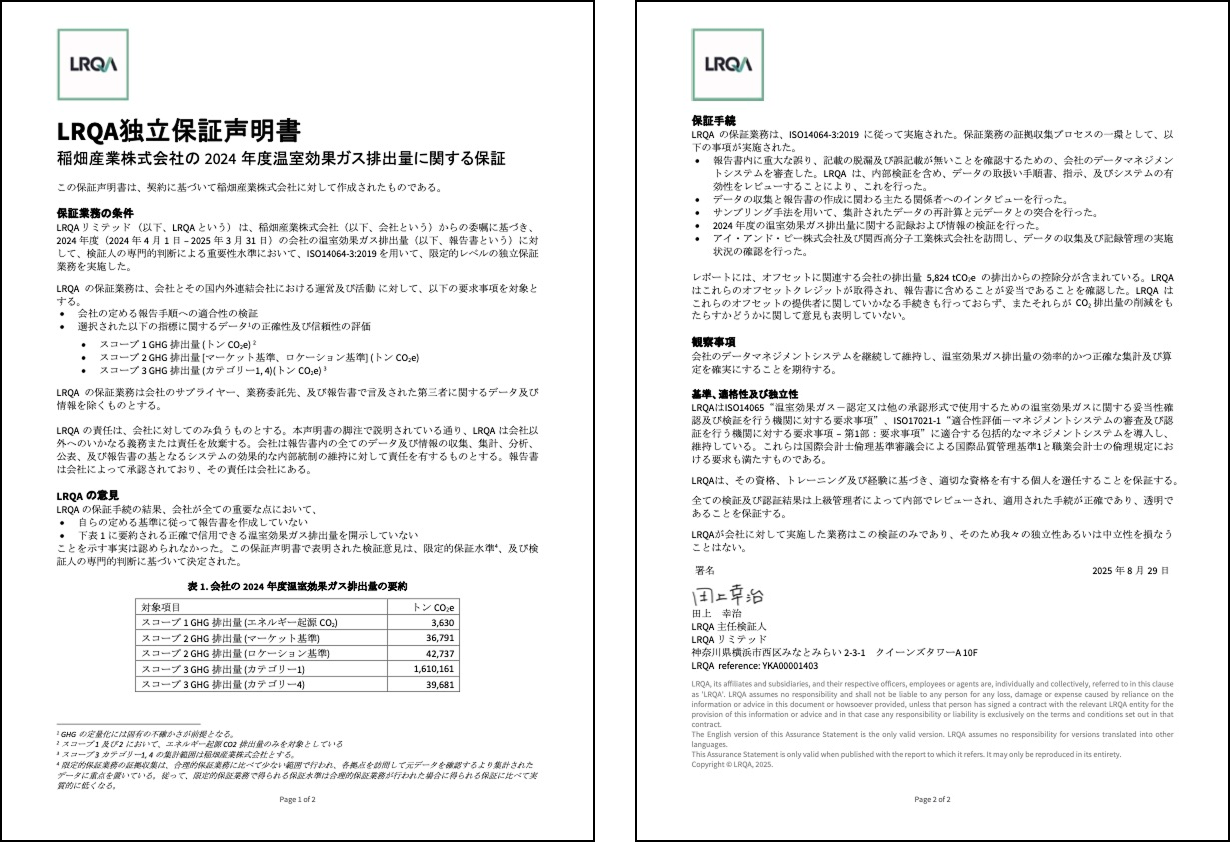 4)に対し国際基準であるISO14064-3:2019に基づく第三者検証を受け、検証機関であるLRQAリミテッドによる独立保証声明書を取得しました。これにより、ステークホルダーに対し正確性・信頼性の高いデータを開示することが可能になりました。